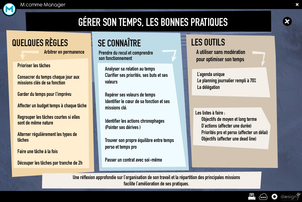 Une expérience ludique et pédagogique qui pousse à regarder le manque de temps autrement, avec des vidéos, des exemples, des fiches, un quiz, et même un exercice papier à faire sur soi, pour retrouver les clés de sa propre efficacité personnel