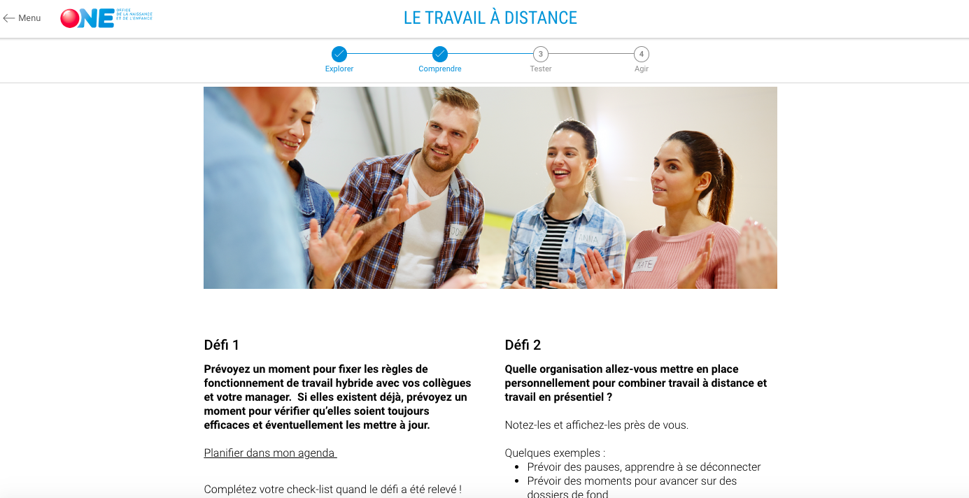 Dans ce contexte et évolutions des méthodes de travail, l’ONE souhaite sensibiliser et former l’ensemble de ses collaborateurs et managers aux fondamentaux du télétravail et travail à distance et du management à distance.